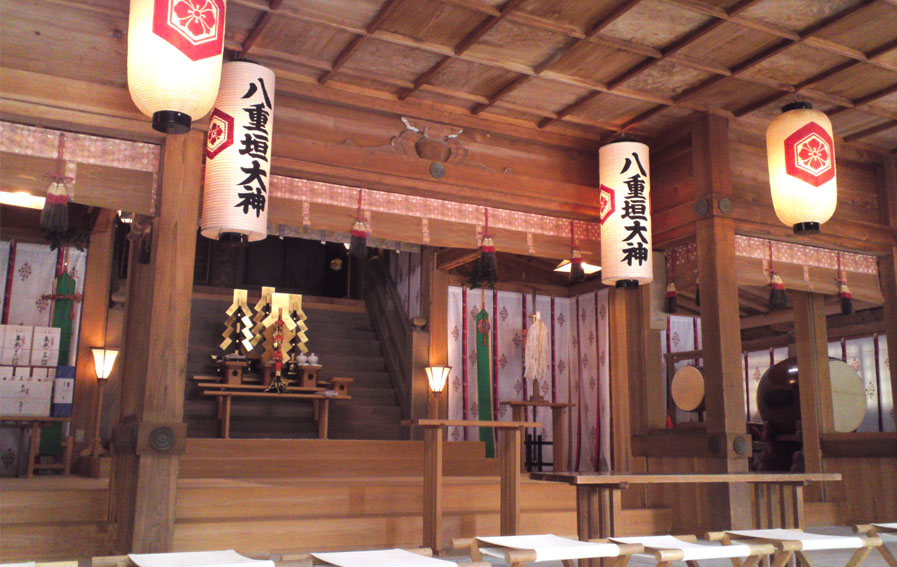 スサノオノミコトがヤマタノオロチを退治した際、のちに妻となるイナタヒメノミコトをオロチから守るため、避難地とした場所がここ八重垣神社のはじまりです。現在の境内の森にある大杉を中心に八重垣を造り、そこに稲田姫命は身をひそめながら、現在「鏡の池」と呼ばれる水面に自分の姿を映していたとされています。